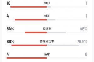 日本10次射门4次射正,控球率54%,传球成功率88%
