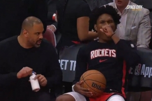 等得挺无聊~火箭VS马刺调整篮筐跳球推迟 KD、阿门都在场边打哈欠