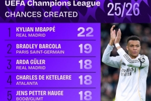 本赛季欧冠创造机会榜:姆巴佩22次居首,巴尔科拉19次第二