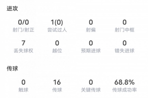木塔力甫全场数据:丢失球权7次,传球16次,传球成功率68.8%