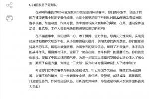 在刚刚结束的2026年亚足联U23男足亚洲杯决赛中,你们勇夺亚军,创造了我国在该项赛事中的历史最佳成绩,也是中国男足国字号球队时隔22年再次晋级洲际赛事决赛,经验可贵,作风可赞,为中国足球振兴燃起新的希望。在此,谨向全体运动员、教练员、工作人员表示热烈的祝贺和亲切的慰问!