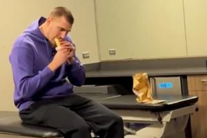 在视频中,约基奇首先说道“因为那个(选秀广告)我从不吃Taco Bell。”镜头一转,是他在更衣室首次品尝卷饼一幕。