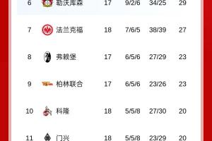 德甲积分榜:拜仁四连胜11分领跑,多特第2,霍村第3,药厂第6