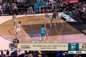 目前三分6中2!库里连续20场命中至少2记三分 NBA史上最长纪录
