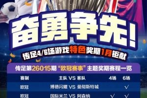 第26015期传足4/6场游戏特色奖期已经于2026年1月18日20:00开售,将于2026年1月20日22:00停售,并于2026年1月21日开奖,其中国际米兰VS阿森纳、皇家马德里VS摩纳哥、托特纳姆热刺VS多特蒙德、比利亚雷亚尔VS阿贾克斯为4场进球游戏竞猜赛事。